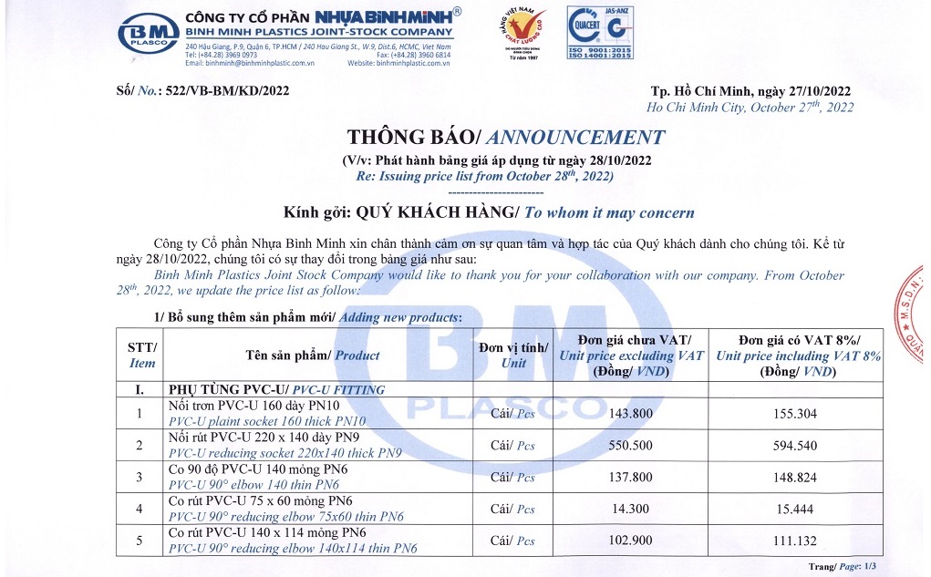 Issuing price list from October 28th, 2022