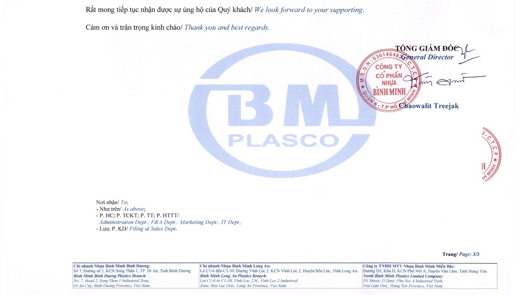 Announcement on Employee Resignation at Binh Minh Plastics