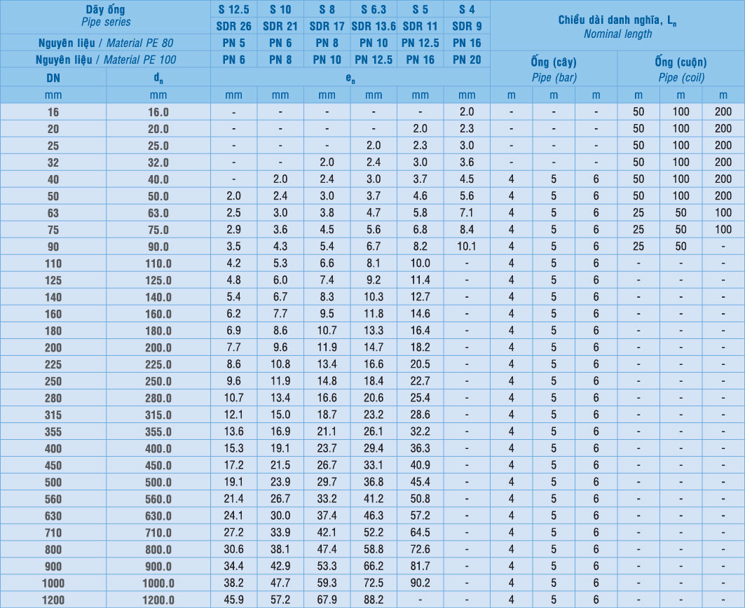 Ống và phụ tùng ống nhựa HDPE – ISO 4427:2007 (TCVN 7305:2008) được sản xuất từ hợp chất nhựa polyethylene tỷ trọng cao: PE80 và PE100.