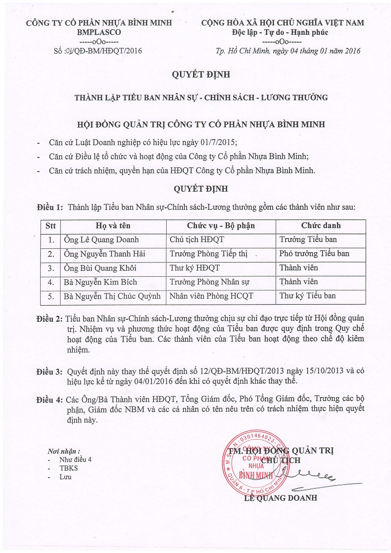 Decision on the Establishment of the Subcommittee on Human Resources, Policies, and Compensation