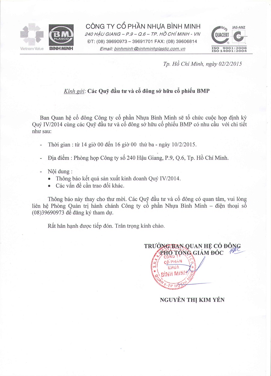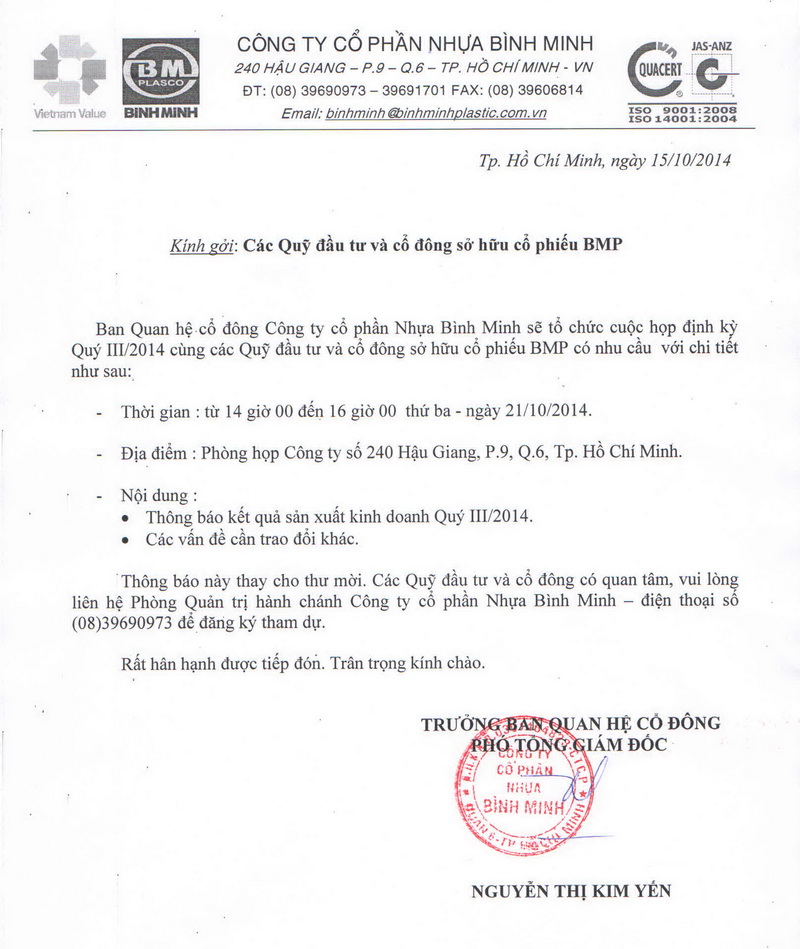 Tổ chức cuộc họp định kỳ Quý III/2015 cùng các Quỹ đầu tư và cổ đông sở hữu cổ phiếu BMP