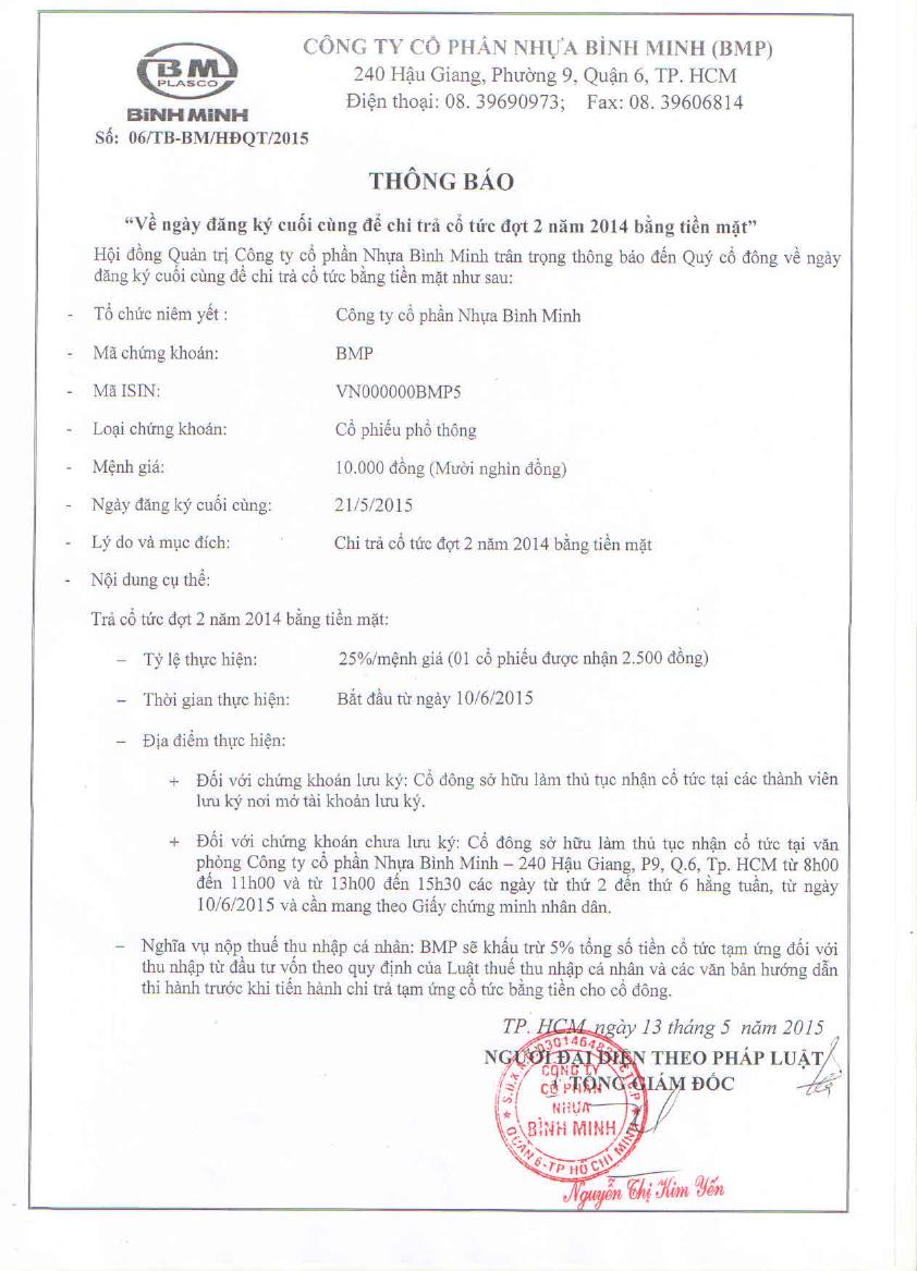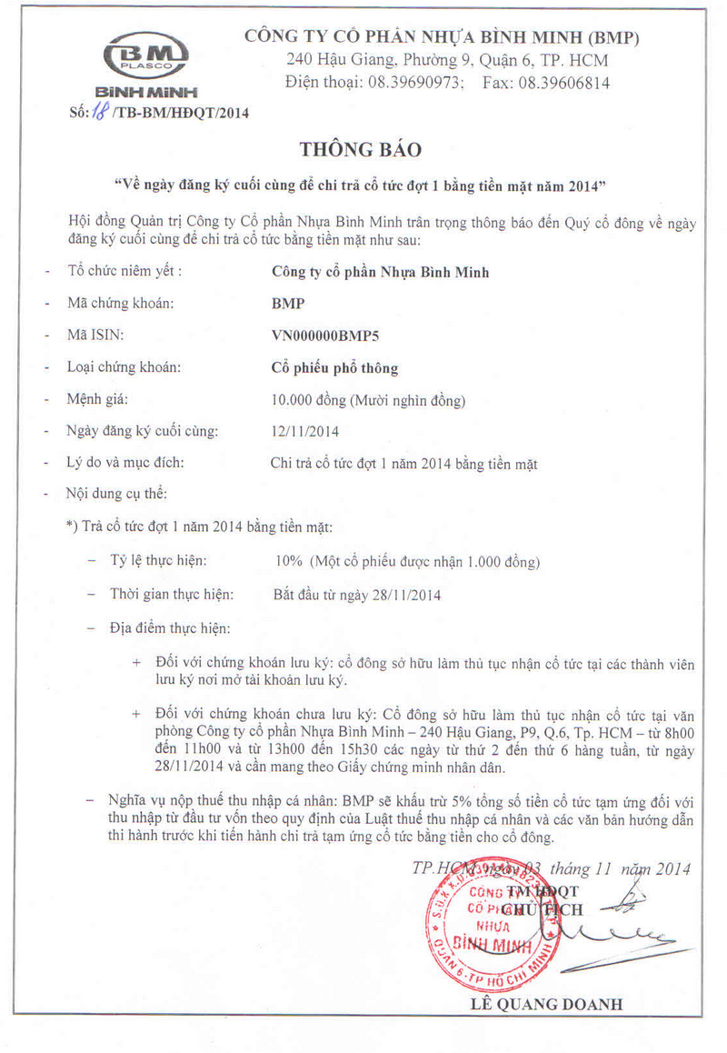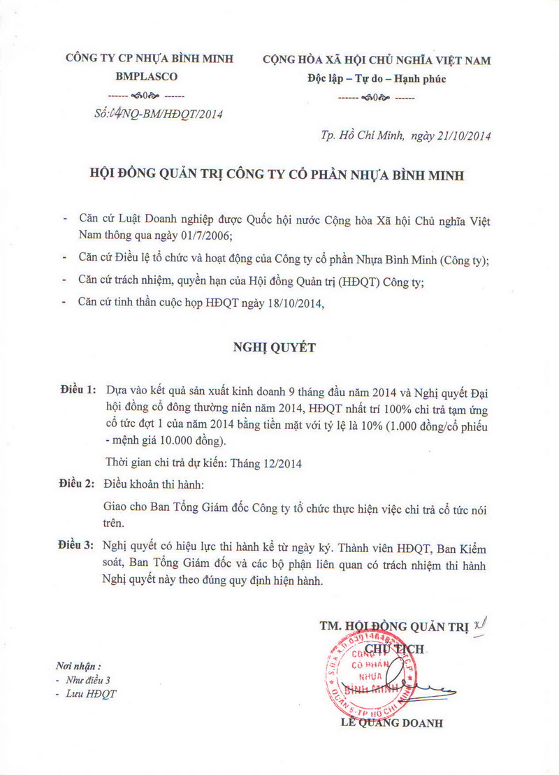Resolution No. 04/NQ-BM/HĐQT/2014 on the First Interim Cash Dividend Payment for 2014 at a Rate of 10%