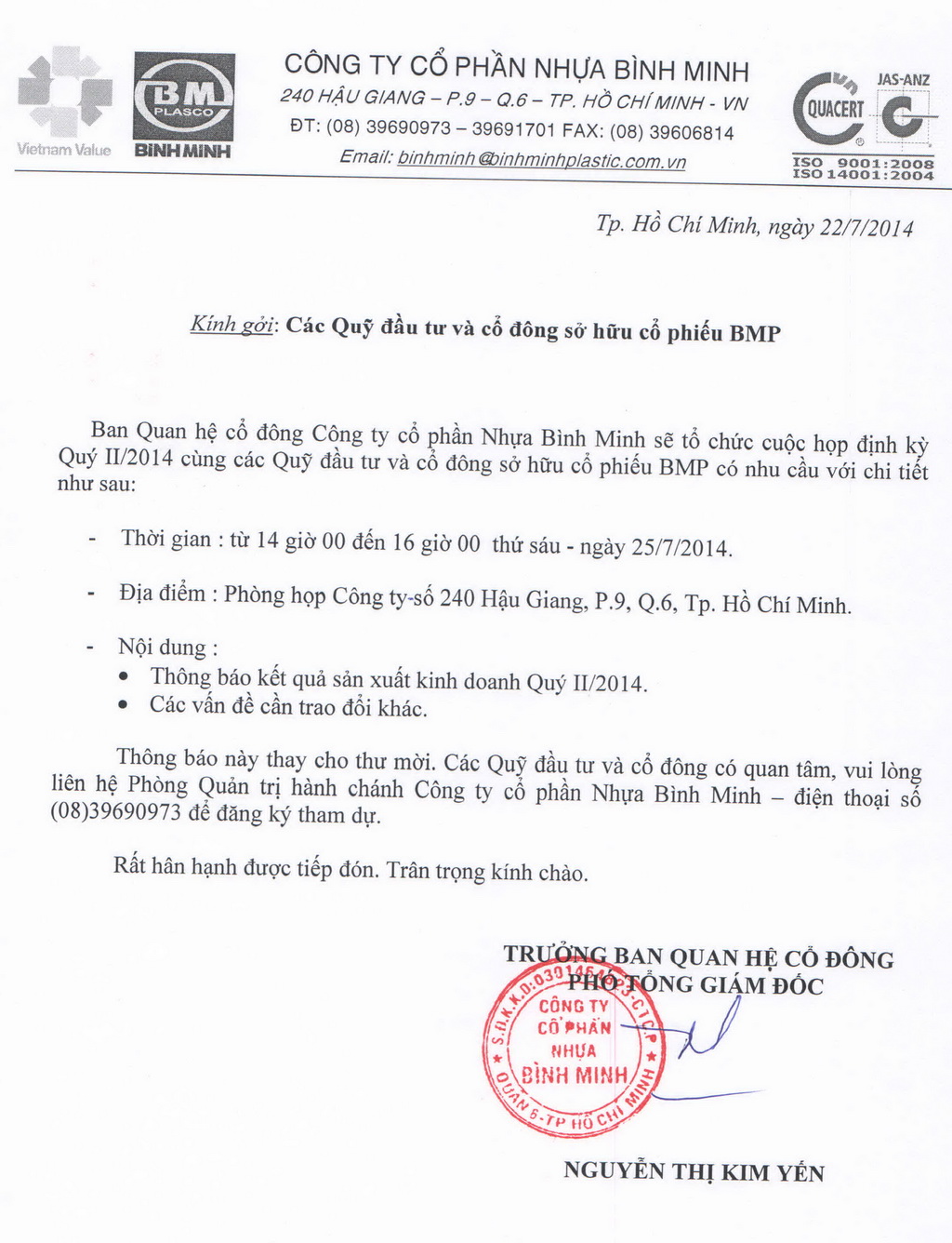 Regular Meeting for Q2/2014 with Investment Funds and BMP Shareholders"