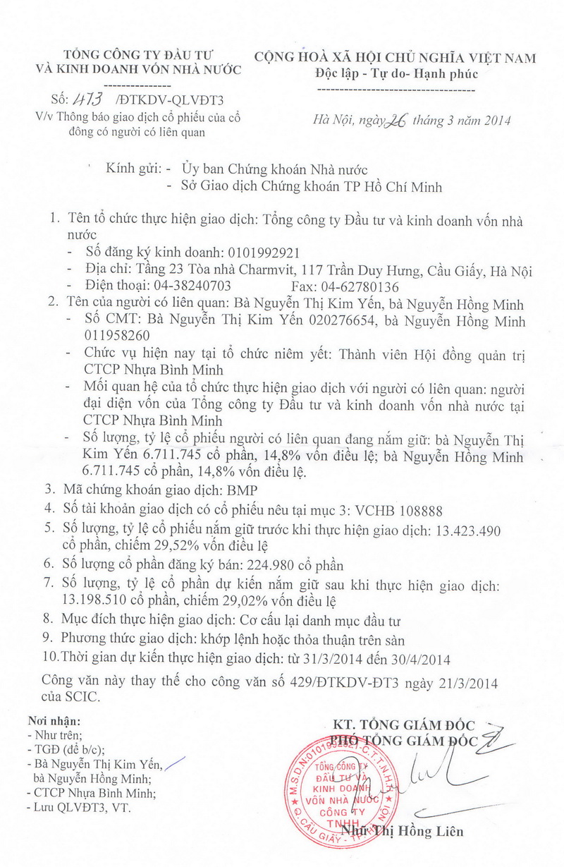 Document Regarding the Collection of Corporate Income Tax Arrears from Binh Minh Plastics Joint Stock Company by SCIC