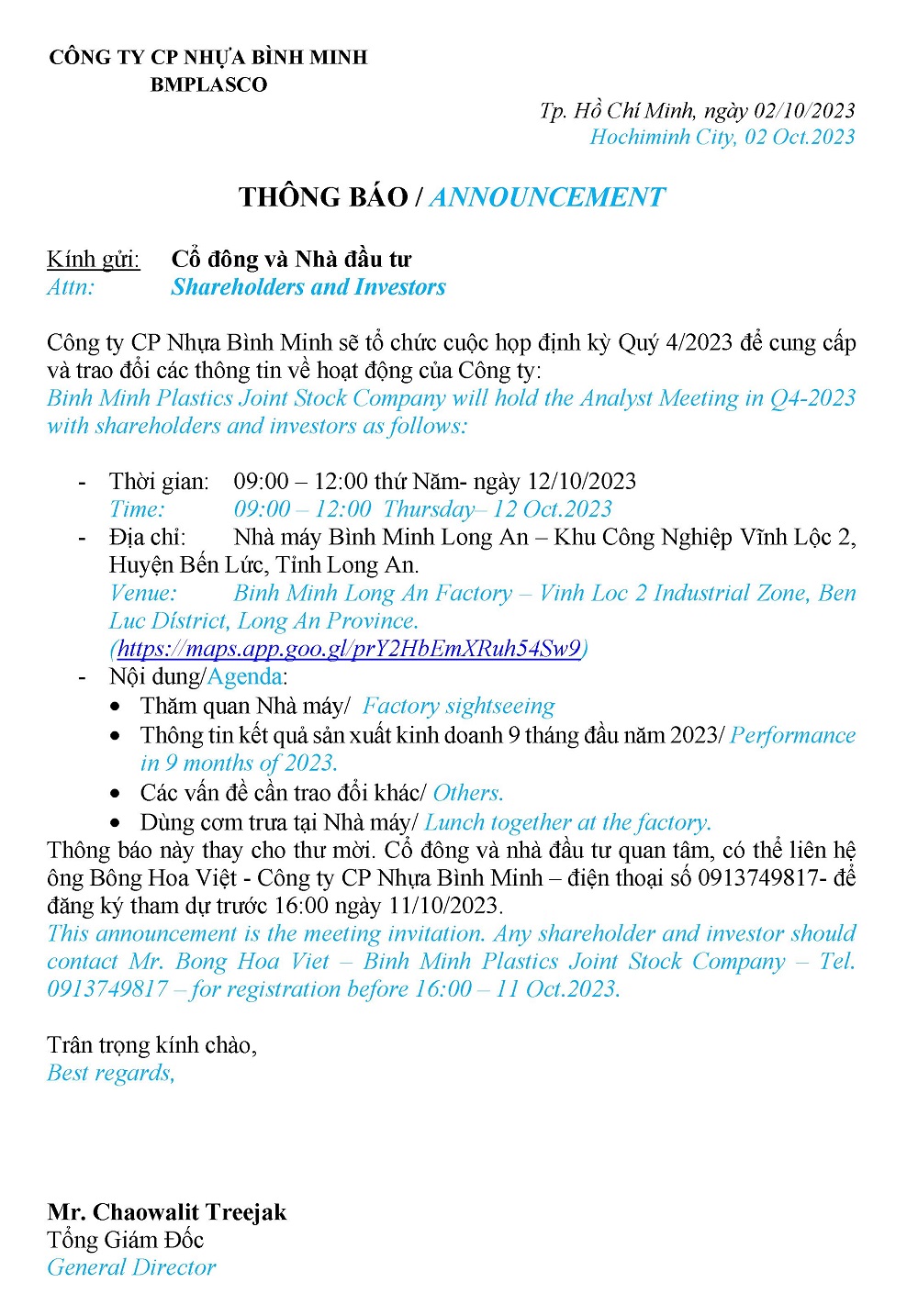 Binh Minh Plastics Joint Stock Company will hold the Analyst Meeting in Q4-2023