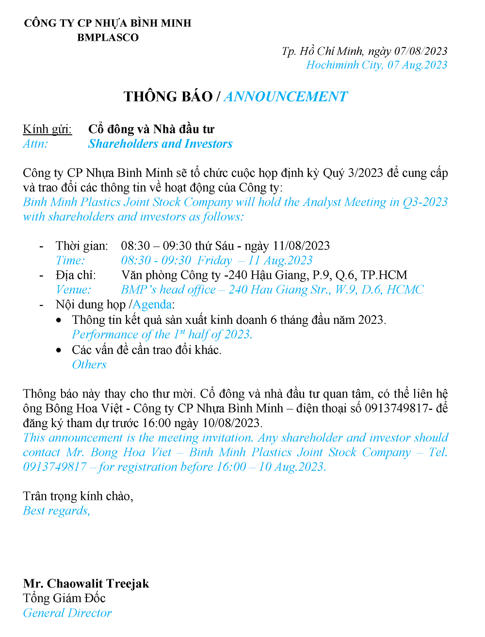 Will hold Analyst Meeting for Q3/2023 with shareholders and investors as follow