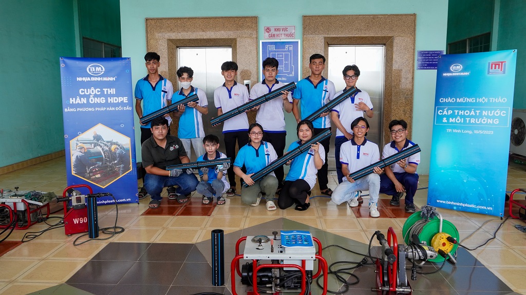 Through the program, Binh Minh Plastics shared useful information about the Water Supply and Drainage major with the students and introduced the Company's high-quality product lines. In particular, Binh Minh Plastics also organized the "HDPE pipe welding by butt fusion method" competition for the students and received a positive response.