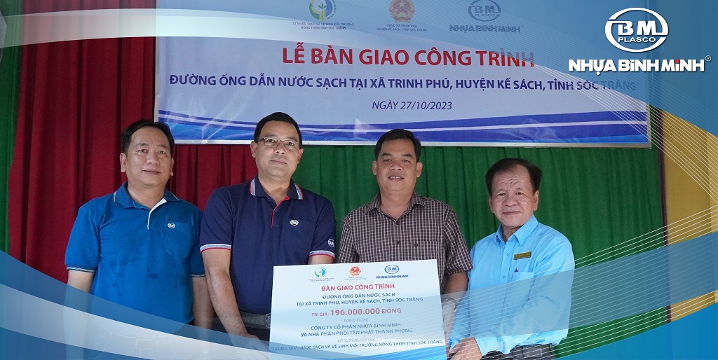 Thấu hiểu khó khăn của người dân trong việc tiếp cận nguồn nước sạch, Công ty Cổ phần Nhựa Bình Minh đã tài trợ sản phẩm ống PVC-U và nhà phân phối Tấn Phát Thanh Phong tài trợ vận chuyển cùng sự tham gia thi công của 60 viên chức, người lao động thuộc TTNS & VSMTNT tỉnh Sóc Trăng đã hoàn thành 1.200m đường ống dẫn nước sạch cho khoảng 25 hộ dân. Công trình đã giúp người dân địa phương tiếp cận nguồn nước sạch, đảm bảo an toàn sức khỏe và nâng cao chất lượng cuộc sống.