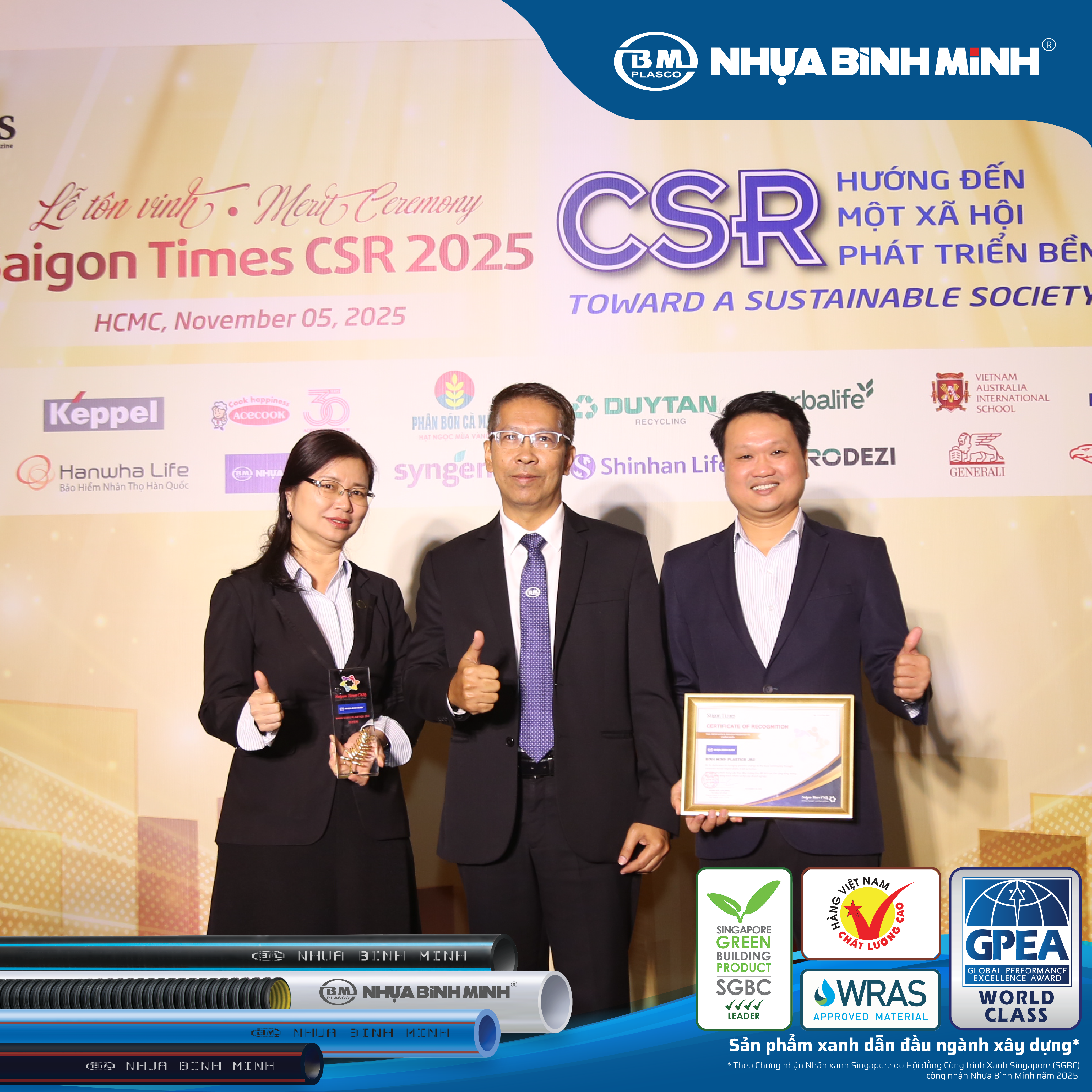 Nhựa Bình Minh là một trong 40 doanh nghiệp được vinh danh tại Giải thưởng Saigon Times CSR 2025. Đây là lần thứ 4 liên tiếp công ty nhận được giải thưởng uy tín này.