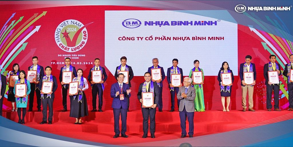 Tối ngày 14/3/2024 vừa qua, tại Hội trường Dinh Thống Nhất số 135 Nam Kỳ Khởi Nghĩa, P. Bến Thành, Q. 1, Tp. HCM, Công ty Cổ phần Nhựa Bình Minh vinh dự đón nhận danh hiệu “Hàng Việt Nam chất lượng cao 2024 – Ngành nhựa Công nghiệp” do Hội Doanh nghiệp hàng Việt Nam Chất Lượng Cao tổ chức.