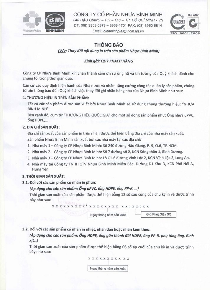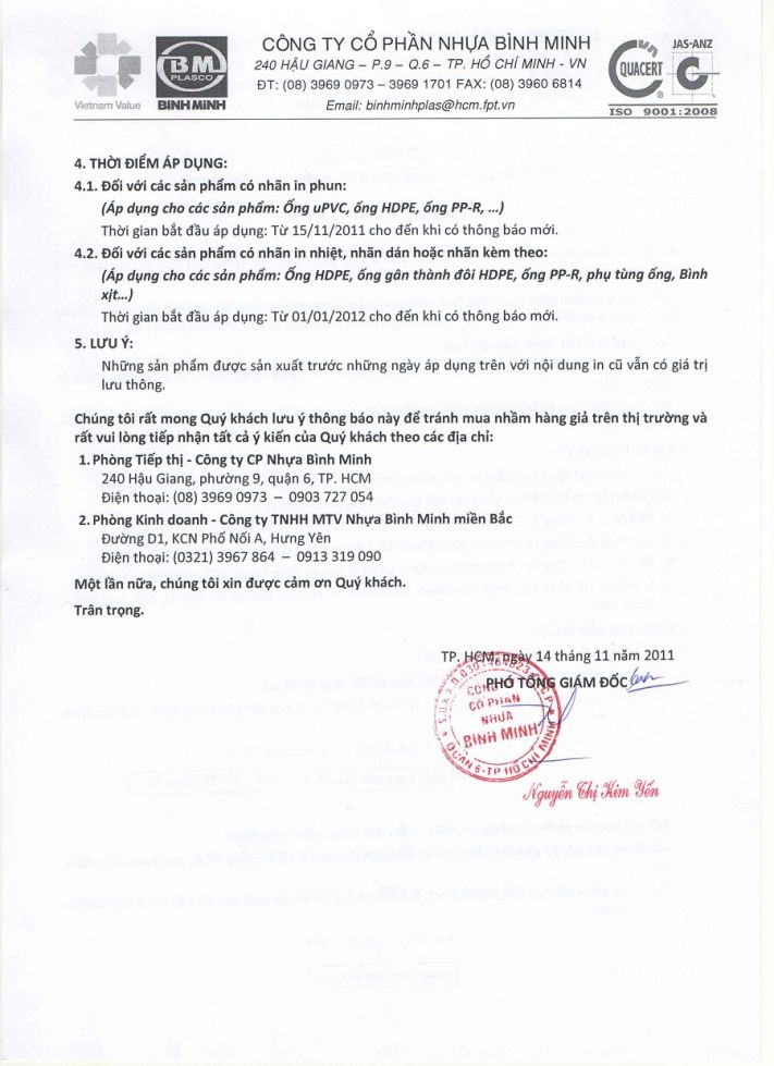 Thay đổi nội dung in trên sản phẩm Nhựa Bình Minh